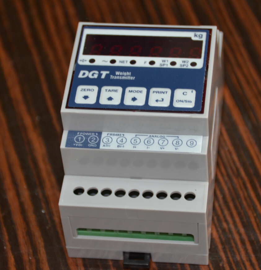DGT1AN帶有模擬輸出的 DIN bar 重量變送器。5 鍵鍵盤、LED 顯示、實時時鐘、不在場證明。多功能稱重程序。