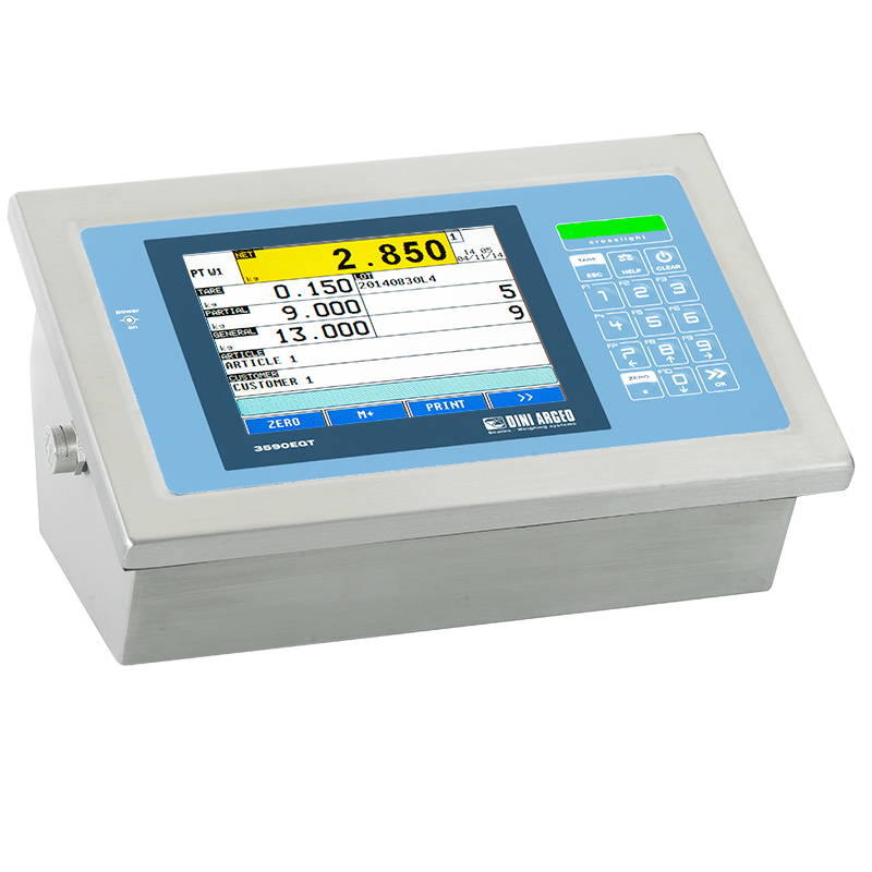Digital weight indicator with a big touch screen display, suitable for advanced industrial applications. It allows the visualization of all the weighing data and the customization of the screens, simplifying the user operations. Fitted with 3 serial ports, transmission protocols for data communication, completely configurable printouts, integrated alibi memory, and port for connection to barcode/badge reader. CE-M approvable (OIML R-76 / EN 45501).